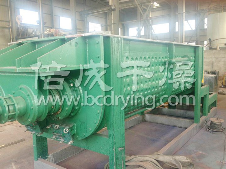 空心軸上密集排列著楔型中空漿葉,熱介質(zhì)經(jīng)空心軸流經(jīng)漿葉。單位有效容積內(nèi)傳熱面積很大,熱介質(zhì)溫度從-40℃到320℃,可以是水蒸汽,也可以是液體型:如熱水、導(dǎo)熱油等。間接傳導(dǎo)加熱,沒有攜帶空氣帶走熱量,熱量均用來加熱物料。熱量損失僅為通過器體保溫層向環(huán)境的散熱。楔型漿葉傳熱面具有自清潔功能。物料顆粒與楔型面的相對運動產(chǎn)生洗刷作用,能夠洗刷掉楔型面上附著物料,使運轉(zhuǎn)中一直保持著清潔的傳熱面。漿葉干燥機的殼體為Ω型,殼體內(nèi)一般安排二到四根空心攪拌軸。殼體有密封端蓋與上蓋,防止物料粉塵外泄而充分發(fā)揮作用。