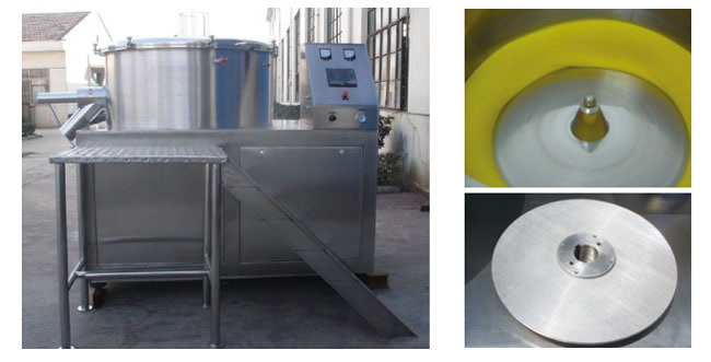 本機(jī)是通過(guò)設(shè)置旋轉(zhuǎn)離心盤、鼓風(fēng)機(jī)、氣動(dòng)噴槍,將濕顆粒制成美麗的球丸。將前道工序做成的濕顆粒投入旋轉(zhuǎn)離心盤內(nèi),啟動(dòng)鼓風(fēng)機(jī)后再將旋轉(zhuǎn)離心盤啟動(dòng),使?jié)耦w粒受到環(huán)隙空氣浮力、旋轉(zhuǎn)離心力、自身重力作用,呈環(huán)周繩股狀運(yùn)動(dòng),從而形成真球度極高的球丸。旋轉(zhuǎn)盤自動(dòng)升降,使物料的收集和制丸速度大大提高。
